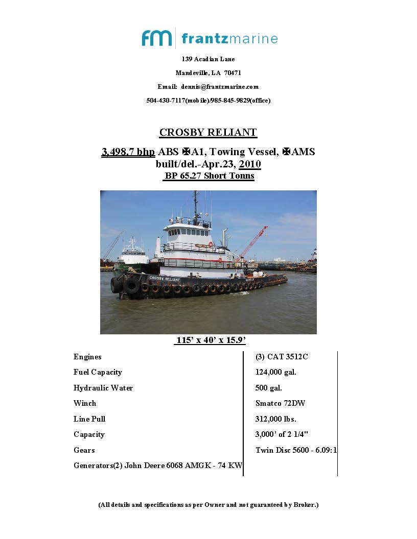 Frantz Marine has the exclusive listing from Financial Institute, with Crosby's approval, to sell the following vessels: